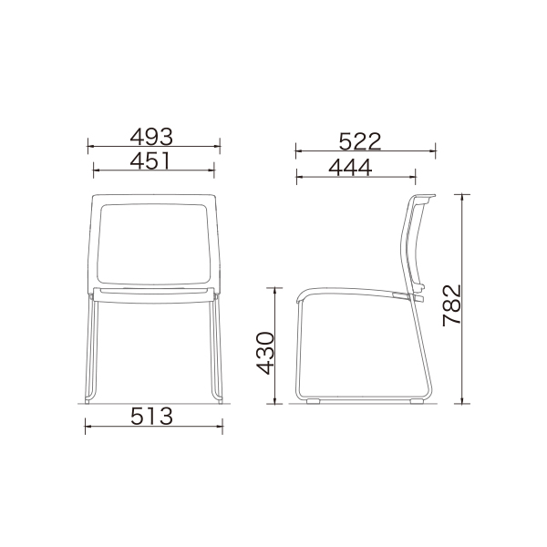 | 商品仕様 | 背/座:PP樹脂成型品+ポリエステルメッシュ 脚:スチールパイプ/12.7径(クロームメッキ) |