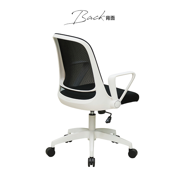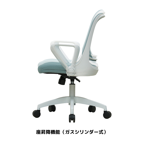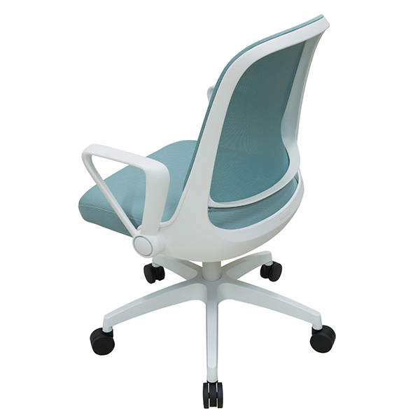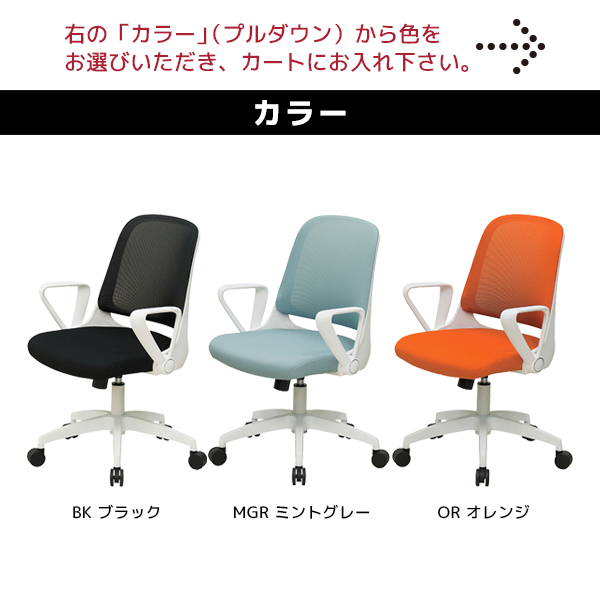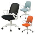 丸みのあるホワイトフレームと可愛らしい張地カラーが特徴的な背メッシュチェア。座は布張りとなります。