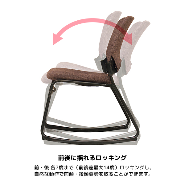 前・後 各7度まで(前後差最大14度)ロッキングし、自然な動作で前傾・後傾姿勢を取ることができます。