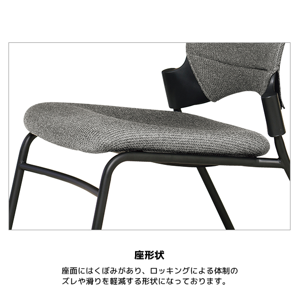 座面にはくぼみがあり、ロッキングによる体制のズレや滑りを軽減。