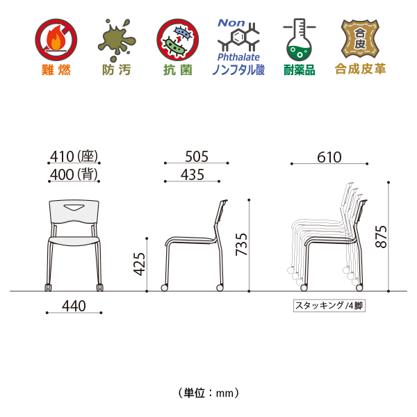 | 備考 | ■スタッキング可能(4脚まで) ■キャスター付き ■座裏にはスタッキング時に傷がつかないようPP再生樹脂製カバーが付いています。 |