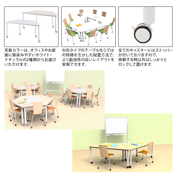 同「キャスターテーブル」シリーズの6タイプのミーティングテーブルを組み合わせることで、ユニークかつ創造性の高いレイアウトで多用途にご使用いただけます。「CTTシリーズ」でご検索下さい。