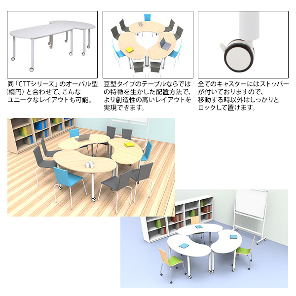 同「キャスターテーブル」シリーズの6タイプのミーティングテーブルを組み合わせることで、ユニークかつ創造性の高いレイアウトで多用途にご使用いただけます。「CTTシリーズ」でご検索下さい。