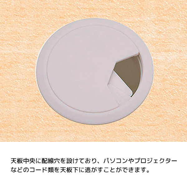 天板中央に配線穴があり、そこから天板下にコードを逃がすことができますので、パソコンやプロジェクターを使ったミーティングにも最適。
