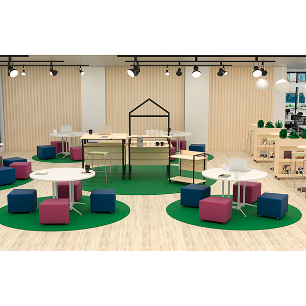直径120cmの円形天板のテーブルは、フリーアドレスとしてなら4人、ミーティングなら4~6人程でご利用いただけます。