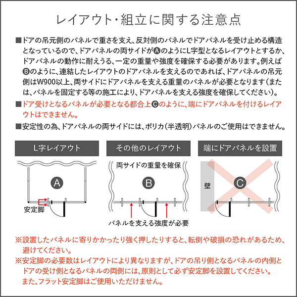 ★必ずドアパネルの両サイドに同じ高さのパーティションを設置してください。ドアパネルの吊元側は最低でもW900以上のパネルが必要になります。