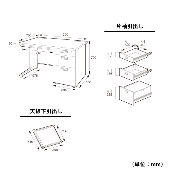 | 内寸法 | 【天板下引出内寸】 幅714mm × 奥行398mm 【サイド引出内寸】 (1段目) 幅318mm × 奥行420mm × 高さ97mm (2段目) 幅318mm × 奥行420mm × 高さ186mm (3段目) 幅318mm × 奥行420mm × 高さ285mm |