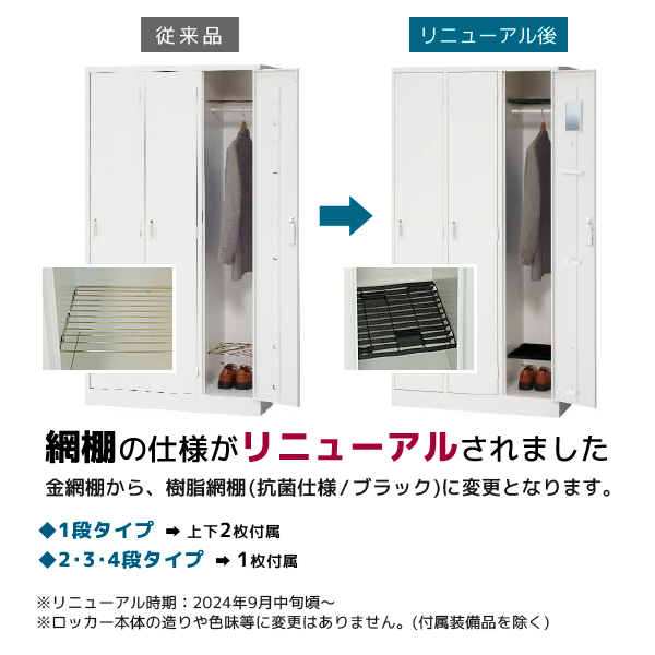 | 備考 | ■開閉表示付きシリンダー錠 ■カマ錠、ラッチ付 ■鍵付(リバーシブルキー/1扉につき2本) ■ハンガーパイプ付(耐荷重:20kg) ■網棚1枚付き(耐荷重:10kg) |