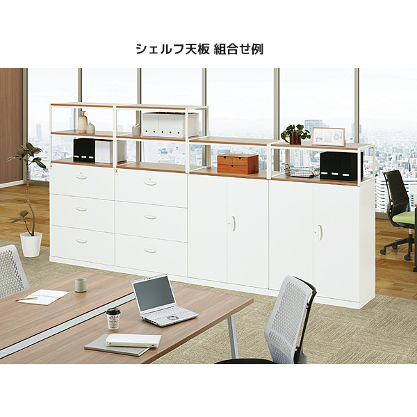 高さ750mmやH1050mmの下置き書庫の上部にこちらのシェルフ天板を設置することで、天面スペースを有効活用できます。