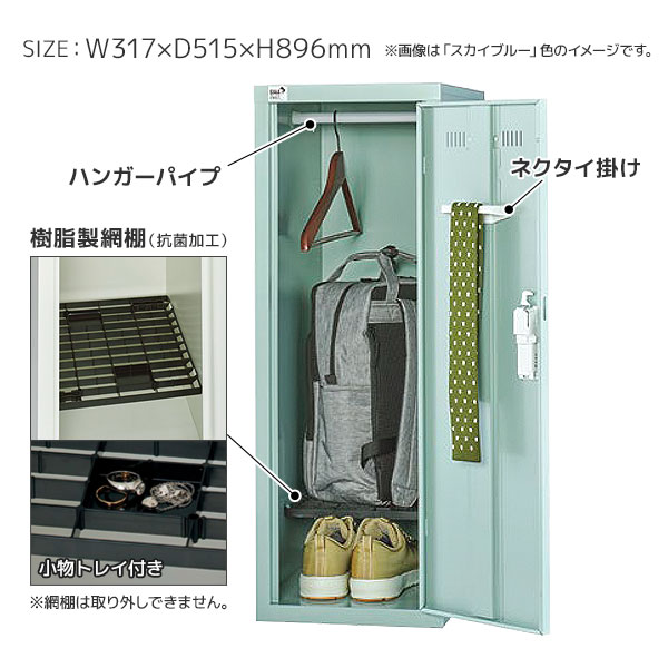高さ約900mmのコンパクトなロッカーながら、ハンガーロッカーや網棚、ネクタイ掛けなどが付属し、使い勝手の良い機能を備えています。
