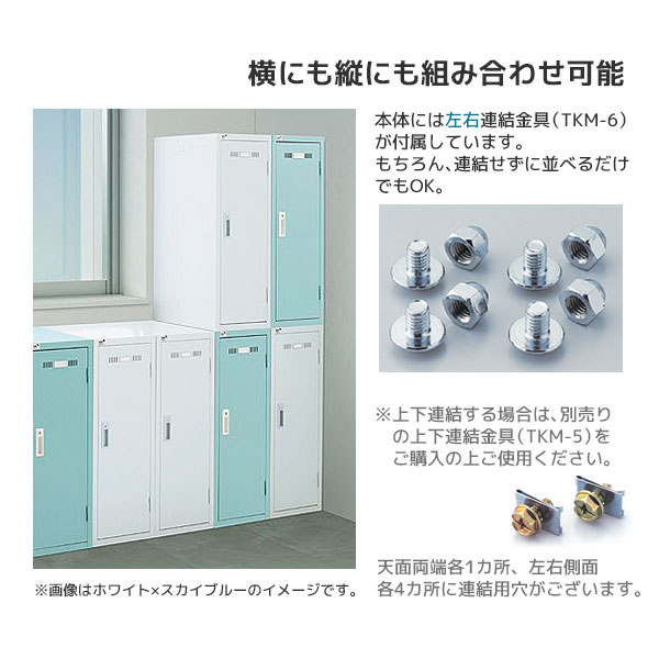 | 備考 | ■南京錠用タイプ (南京錠は付属しませんので、別途ご用意ください。) ■ハンガーパイプ付き(耐荷重:20kg) ■樹脂製 網棚1枚付き(耐荷重:10kg) ■ネクタイ掛け付き ■左右連結金具(TKM-6)付き ■連結用穴(天面両端各1カ所、左右側面各4カ所) ■穴かくし10個付き ※上下連結される場合は、別売りの上下連結金具(TKM-5)をご購入の上ご使用ください。 |